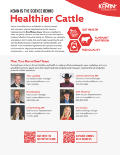 Since 1961, Kemin has used advanced molecular science and scientific expertise to unlock a wide range of beef cattle nutrition and health discoveries — including industry-leading solutions for gut health, ruminant nutrition and feed quality. We understand your need to raise a healthy herd that provides consumers the nutritional benefits they are looking for in their dairy, while also returning a profit. Plus, every Kemin product is backed by technical, lab and product support to ensure you get the most out of every solution.