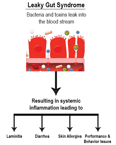 Equine gut health is more than just colic, ulcers and diarrhea. When the gut is damaged by stressors such as disease, exercise or travel, Leaky Gut Syndrome (LGS) can occur — allowing pathogens and toxins in the gut to pass into the blood stream. LGS can lead to systemic inflammation that negatively impacts performance, behavior and overall horse health. The best way to prevent LGS or to heal a leaky gut is through good nutrition and attention to gut health.