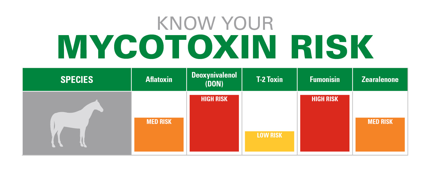 Of the hundreds of known mycotoxins, the five main profit-robbing mycotoxins of concern to livestock and poultry producers are: aflatoxin, deoxynivalenol, T-2 Toxin, zearalenone and fumonisin. Produced by Aspergillus species, aflatoxins are a group of chemicals considered carcinogenic (cancer-causing) to animals and humans.1 Trichothecenes, like deoxynivalenol (DON) and T-2 Toxin, are produced on many different grains like wheat, oats or corn by various Fusarium species. These toxins are frequently found together and can cause feed refusal and poor weight gain. Fumonisin can inhibit lipid metabolism, leading to immune suppression and nervous system damage. In horses, fumonisin contamination can lead to leukoencephalomalacia.2 Zearalenone acts as an estrogenic molecule which can adversely impact reproduction. Fumonisin and zearalenone are also produced by Fusarium molds.