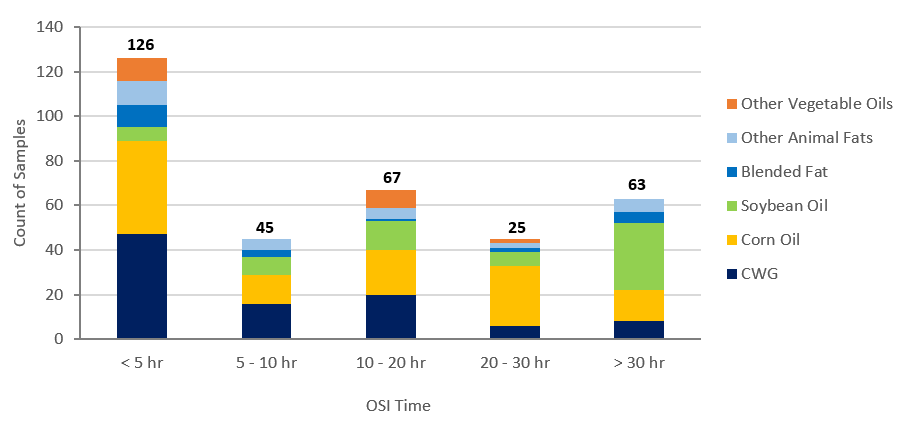 Figure 2. Oxidative stability index (OSI) of fat and oil samples (n=346) analyzed by Kemin CLS from January 2018 – September 2020. The number above each column represents the total number of samples within each OSI time range. CWG = choice white grease.
