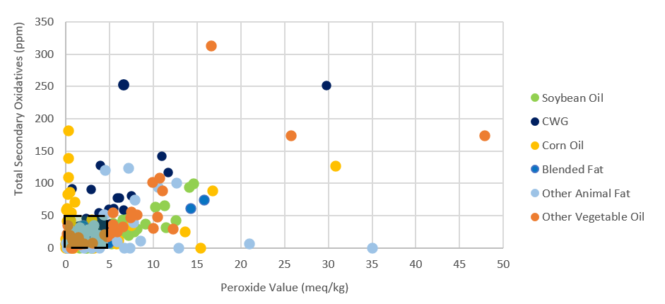 The variability of the current state of oxidation of fats and oils is shown in Figure 1. As a general guideline, fats and oils should contain a peroxide value (PV) less than 5 meq/kg and a total secondary oxidative value less than 50 ppm.3 This is indicated in Figure 1 by the shaded box. Of the samples that exceeded general guidelines, soybean oil and other animal fats tended to show elevated PV while choice white grease (CWG) and other vegetable oil often had elevated PV and secondary markers.