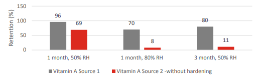 Figure 1. Stability of two Vitamin A sources in a concentrated premix depending on storage time and relative humidity (RH).1