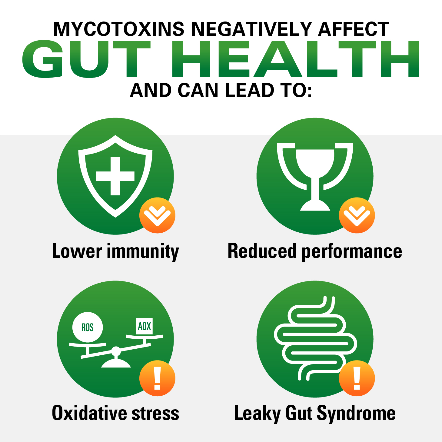 Oxidative stress occurs when reactive oxygen species (ROS), like free radicals, exceed the antioxidant capacity of cells. Research has shown mycotoxins alter expression of multiple primary antioxidant enzymes, thereby resulting in accumulation of ROS, which can lead to localized inflammation, membrane lipid oxidation, altered cellular metabolism and eventually cell death.5 Mitigating mycotoxin-induced oxidative stress may be a potential strategy to limit toxic effects mycotoxins have on gut health.