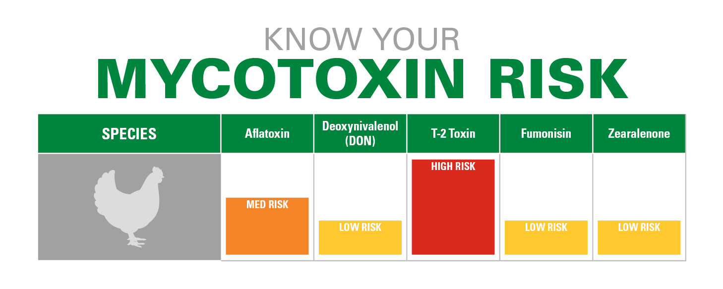Of the hundreds of known mycotoxins, the five main profit-robbing mycotoxins of concern to livestock and poultry producers are: aflatoxin, deoxynivalenol, T-2 Toxin, zearalenone and fumonisin. Produced by Aspergillus species, aflatoxins are a group of chemicals considered carcinogenic (cancer-causing) to animals and humans.1 Trichothecenes, like deoxynivalenol (DON) and T-2 Toxin, are produced on many different grains like wheat, oats or corn by various Fusarium species. These toxins are frequently found together and can cause feed refusal and poor weight gain. Fumonisin can inhibit lipid metabolism, leading to immune suppression and nervous system damage. Zearalenone acts as an estrogenic molecule which can adversely impact reproduction. Fumonisin and zearalenone are also produced by Fusarium molds.