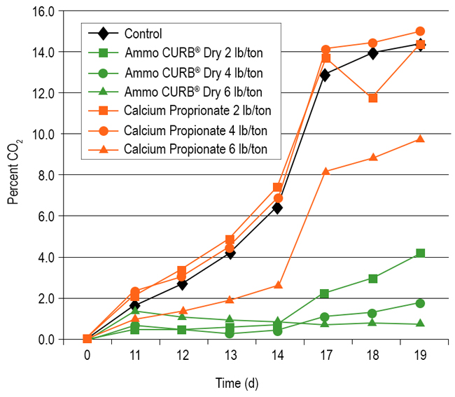At each treatment level, Ammo CURB Dry outperformed calcium propionate in the inhibition of microbial growth. The CO2 evolution data indicates the lowest application rate of Ammo CURB Dry to be more efficacious than the highest application rate of calcium propionate.