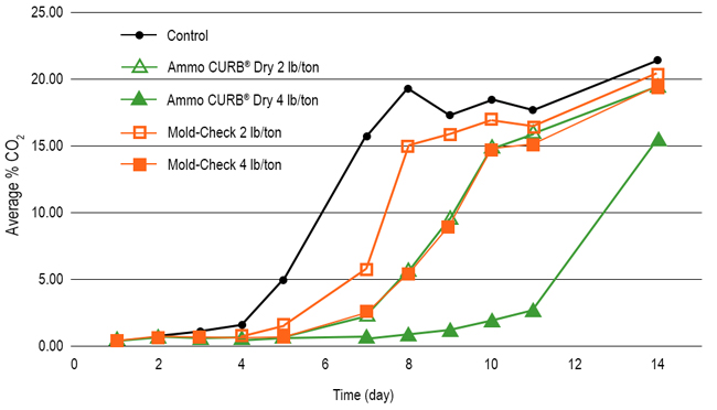 Carbon dioxide (CO2) studies were conducted to determine the efficacy of Ammo CURB Dry compared to a competitive dry mold inhibitor in controlling microbial growth in complete animal feed. CO2 is a product of microbial respiration and is indicative of mold growth. Mold growth can reduce the nutritive quality of feed.3