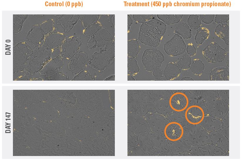 Longissimus muscle biopsies from cattle supplemented chromium propionate had an increase in internalized GLUT4s after a 147-day feeding period, which indicated these animals had more sufficient insulin sensitivity compared to the controls at day 147.