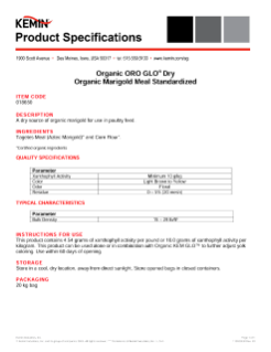 Organic ORO GLO is made from organically grown marigold petals. These marigolds are manufactured to the United States Department of Agriculture's National Organic Program (USDA NOP) standards to be used in organic poultry feed.