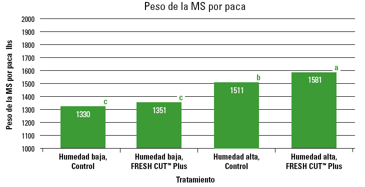 En un estudio realizado en el Valle de San Joaquín, California, el productor obtuvo más materia seca por paca cuando estas fueron tratadas con FRESH CUT Plus. Dada la configuración del equipo de empaque durante el estudio, empacar con mayor contenido de humedad y la aplicación de FRESH CUT Plus en las tasas recomendados, se recuperó aproximadamente 19 % más de materia seca (MS) de alfalfa por hectárea.