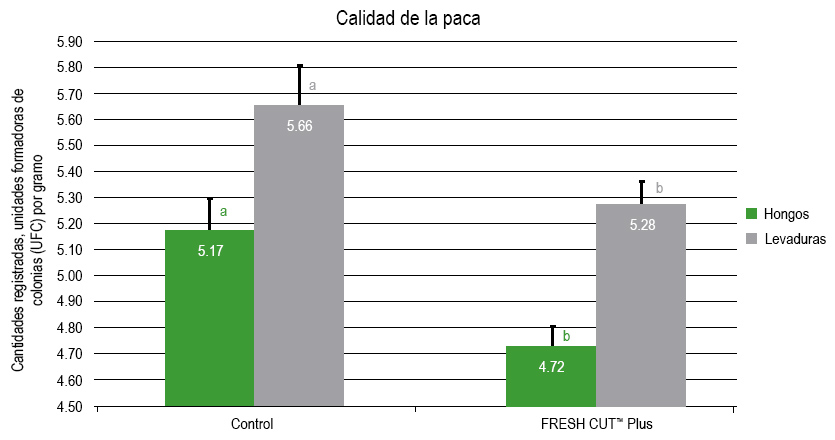La aplicación de FRESH CUT Plus en las tasas recomendadas, disminuyó las cantidades de hongos (P <0.01) y de levaduras (P <0.05) en el heno de alfalfa en pacas, en comparación con el control. Los productos de ácido orgánicos mixtos como FRESH CUT Plus reducen de modo eficaz el desarrollo de hongos y levaduras con el tiempo, dato que es respaldado por los resultados del estudio.