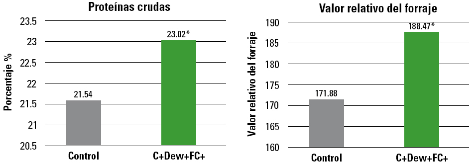 Figura 2. Efectos de la aplicación de FRESH CUT Plus líquido en las proteínas crudas y el valor relativo del forraje de las pacas de heno de alfalfa