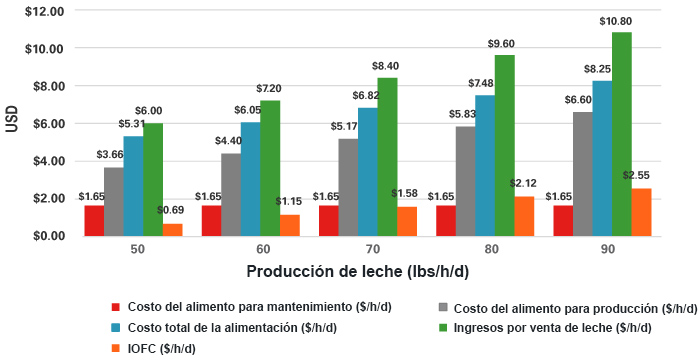 El costo de mantener cada vaca en el rebaño es el mismo si esta produce 27 o 41 kg de leche /vaca/día. En ambas situaciones, se requiere la misma cantidad de materia seca para satisfacer las necesidades de mantenimiento de la vaca.1 Los costos generales fijos y de operación también son los mismos. La diferencia real está en cuánto gasta usted en alimentación para mantener la mayor producción de leche.