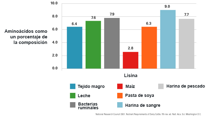 Los productores lecheros se preguntan a menudo cómo pueden aumentar la eficiencia alimenticia. Muchos hatos lecheros reciben dietas que no les aportan cantidades suficientes de lisina. En la gráfica siguiente, los aminoácidos se presentan como porcentajes de la composición. No es posible aportar cantidades suficientes de lisina cuando se usa exclusivamente maíz y pasta soya sin sobrealimentar otros nutrientes, o alimentando con dietas caras, o bien sin causar problemas de salud. El objetivo de los nutriólogos es equilibrar las fuentes de proteínas con las necesidades de lisina del ganado, y hacerlo de la manera más eficiente y rentable.