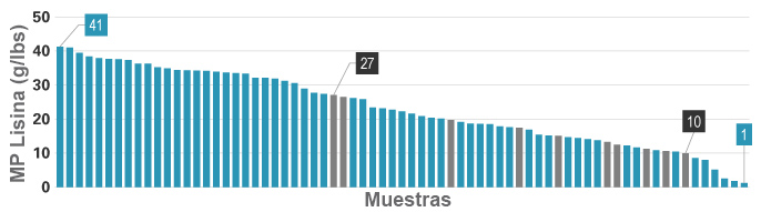 Kemin analiza continuamente las muestras de sangre enviadas por clientes utilizando el análisis de indigestibilidad de nitrógeno in vitro (In Vitro Nitrogen Indigestibility Assay, IVNIDA), un método desarrollado por la Universidad Cornell (Ithaca, NY). El IVNIDA se usa para determinar la variabilidad del suministro de harina de sangre, ya que el color o el tamaño de las partículas no es un indicador de calidad. Los resultados son alarmantes. En la figura a continuación se muestran las pruebas realizadas en más de 70 muestras de harina de sangre. La variabilidad ocurre cuando se observa la PM de lisina; es decir, la cantidad de lisina disponible para el ganado lechero. Las barras grises indican las muestras obtenidas de una planta de alimentos durante un período de un mes, y muestran gran variación, incluso cuando se obtienen del mismo proveedor.