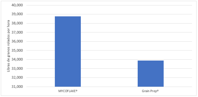 En la Figura 2, un estudio que comparó MYCOFLAKE con Grain Prep® mostró que los operadores que utilizaban MYCOFLAKE podían aumentar el rendimiento de 16.9 a 19.4 toneladas por hora, un aumento de casi el 13 %.1