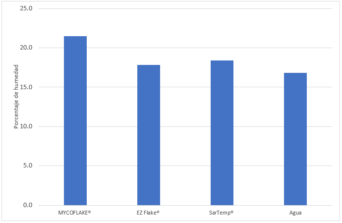 En comparación con dos surfactantes líderes en la industria, el maíz tratado con MYCOFLAKE retuvo más humedad después del rolado.2 Todos los tratamientos con surfactantes tuvieron un nivel de humedad significativamente más alto que el tratamiento con agua solamente. El tratamiento del maíz con MYCOFLAKE generó una mayor retención de humedad en el maíz rolado en comparación con el tratamiento con E-Z Flake® o SarTemp® (Figura 4).