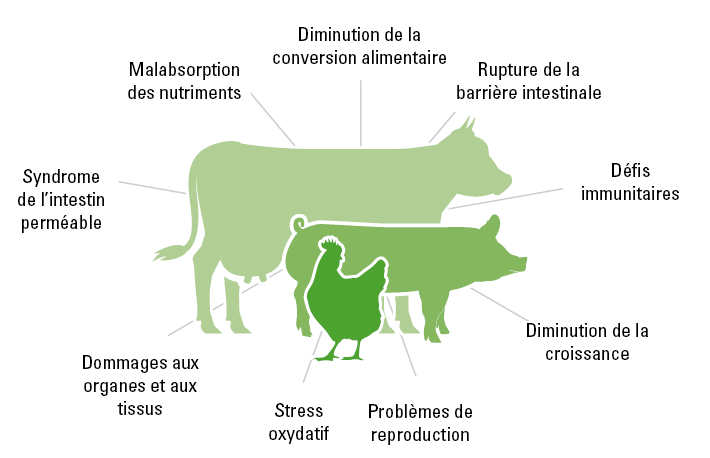 Les éleveurs de bétail et de volaille sont tous conscients de la présence de mycotoxines potentiellement nocives dans les grains. Il semble que tous les jours, on voit passer un nouveau rapport déclarant le dernier point chaud pour la contamination par les mycotoxines. Alors, pourquoi a-t-on soudainement l'impression que les mycotoxines sont présentes partout? Les rapports sont une des principales raisons de la concentration accrue sur la contamination par les mycotoxines. Il existe de plus en plus de données sur les effets néfastes que même de faibles concentrations de mycotoxines peuvent avoir sur la production animale. Avec cette prise de conscience accrue, l'accent est désormais mis sur les signes et symptômes de contamination par les mycotoxines et sur ce que les producteurs peuvent faire pour atténuer leur impact.