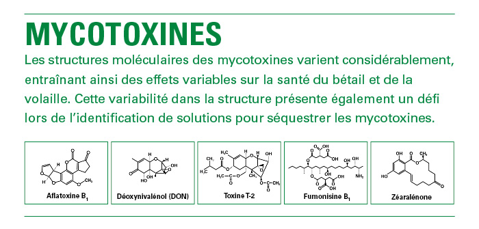 Pour traiter les mycotoxines, il est nécessaire de fournir un supplément qui présente deux caractéristiques essentielles: premièrement, la structure permettant de cibler les toxines, deuxièmement la capacité de séquestrer et de déplacer efficacement les toxines ciblées dans l'ensemble du système gastro-intestinal pour pouvoir être excrétées au lieu de se lier aux tissus mous dans la muqueuse intestinale.