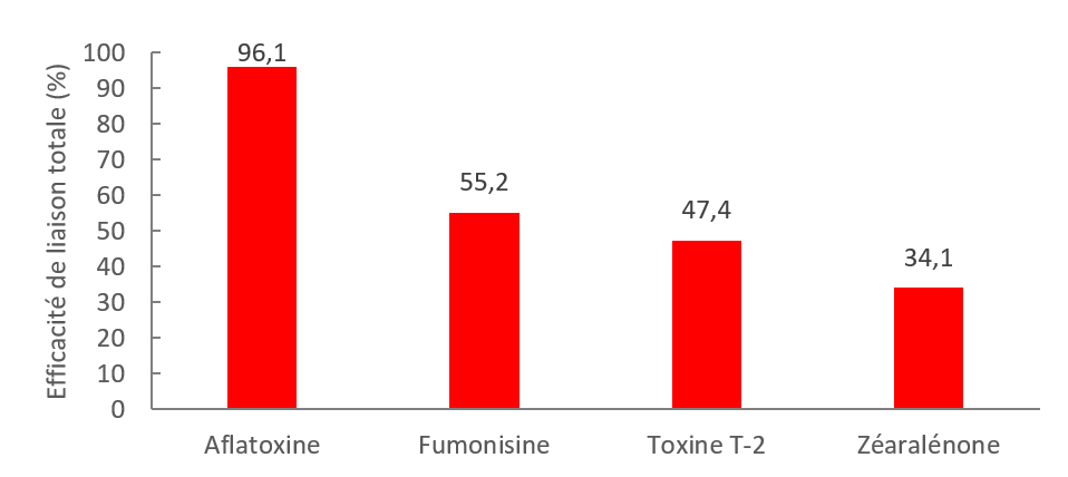 Récemment, un modèle d'efficacité de liaison totale in vitro à deux phases a été utilisé pour évaluer l'efficacité de liaison d'un agent anti-agglomération minéral de zéolite enrichie. La zéolite enrichie a été dosée à un débit équivalent à 0,9 kilogramme de produit par tonne d'aliment. L'aflatoxine B1, la fumonisine B1, la toxine T-2 et la zéaralénone ont été testées à une concentration de 3 ppm dans toutes les expériences. L’efficacité de liaison totale de la zéolite enrichie pour chaque toxine a été déterminée en comparant le pourcentage d'absorption de la toxine dans des conditions tampons acides (pH 4) avec le pourcentage de désorption de la toxine dans des conditions tampons neutres (pH 6,5). Les analyses ont été effectuées en triple exemplaire, les résultats moyens d’absorption et de désorption étant utilisés pour calculer l’efficacité de liaison totale (Graphique 1).7