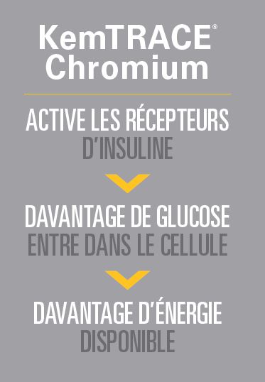 L'insuline est la principale hormone responsable de l'absorption et de l’entreposage du glucose par les tissus sensibles à l'insuline.6 Le muscle et le tissu adipeux sont les principaux tissus sensibles à l'insuline chez les ruminants, mais les muscles représentent plus de 80% de l'absorption de glucose dépendante de l'insuline.7 Le chrome agit de manière à potentialiser l'action de l'insuline, en augmentant la disponibilité de glucose dans la cellule.8 Un supplément de glucose dans la cellule musculaire fournit l'énergie nécessaire pour optimiser la synthèse des protéines, ce qui améliore les performances et augmente le poids de la carcasse à chaud.9