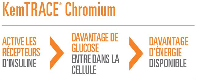 2. Le chrome facilement disponible de KemTRACE® Chromium permet une absorption accrue du glucose par les cellules musculaires par la stabilisation des récepteurs d’insuline et, subséquemment, l’augmentation des transporteurs intracellulaires de glucose-4.