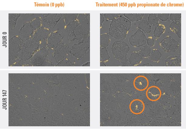 Le GLUT4 est le principal transporteur de glucose, responsable de faciliter le mouvement du glucose dans la cellule.1 Une étude récente a montré que les biopsies du muscle longissimus des bovins recevant du propionate de chrome ont présenté une augmentation des GLUT4 intériorisés après une période d’alimentation de 147 jours (Graphique 1).2 Cela indique que les animaux supplémentés au propionate de chrome présentaient une sensibilité à l’insuline plus importante que les témoins au jour 147. La diminution de la densité de GLUT4 au jour 147 chez les animaux témoins peut indiquer une diminution de la sensibilité à l’insuline ou l’augmentation de la résistance à l’insuline.